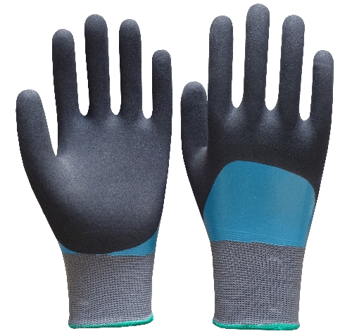| COMPOSITION | Palm: Blue smoothnitrile; Sandy finished nitrile 3/4 coating Lining: 15 gauge nylon or polyester lining |