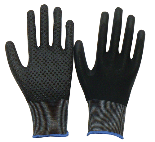 | COMPOSITION | Palm: water-based PU mixed nitrile coating with nitrile dots. Lining: 13 gauge nylon or polyester lining