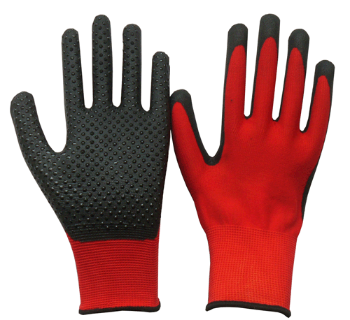 | COMPOSITION | Palm: water-based PU mixed nitrile coating with nitrile dots. Lining: 13 gauge nylon or polyester lining |