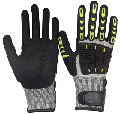 | DESCRIPTION | - 13 gauge UHMWPE mixed glass fiber liner; Sandy nitrile coating on palm - TPR on back of gloves; - Leather on middle concave part between the thumb and index finger - Anti-cut level 3 or 5; Impact resistance - Cuff style: buckles |