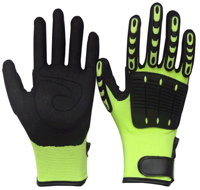 | DESCRIPTION | - 13 gauge Hi-vis yellow polyester liner; Sandy nitrile coating on palm - TPR on back of gloves; - Leather on middle concave part between the thumb and index finger - Impact resistance - Cuff style: buckles |