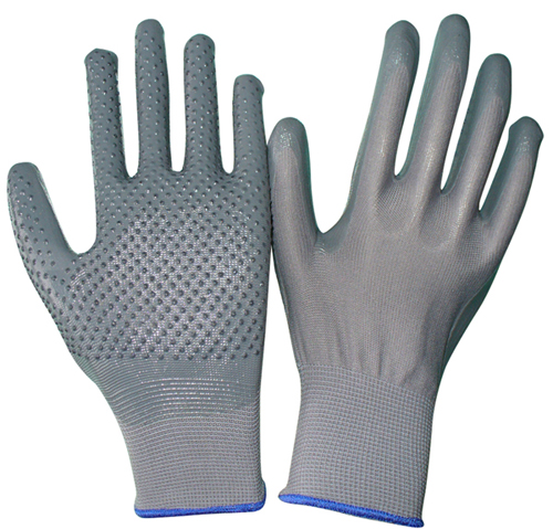 | DESCRIPTION | - 13 gauge seamless polyester lining with PVC dots; nitrile smooth coating on palm - PVC dots enhance excellent grip - Reusable and washable - Elastic knit wrist |
