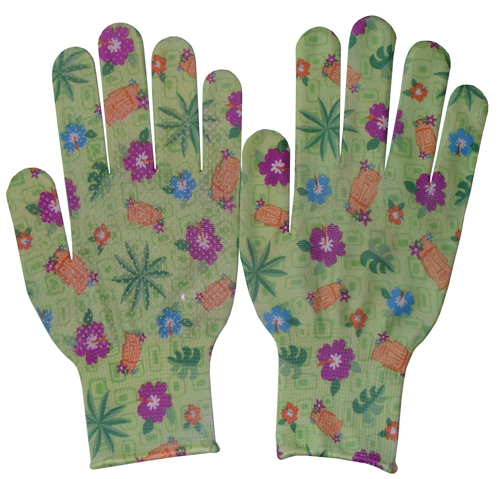 | DESCRIPTION | - 13 gauge seamless polyester with flower printing design; mini PVC dots on palm - Excellent sensitivity and dexterity - Great abrasion resistance - For minimal risks only |