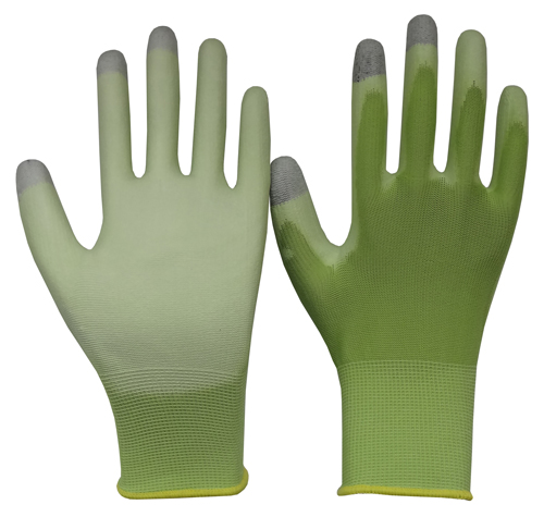 | DESCRIPTION | - Fingertips with conductive fibre helpyou to operate your favorite touch-screen of devices such as IPHONE, IPAD etc. during work time. -13 gauge seamless polyester lining; PU coating on palm. - PU coating provides high abrasion, tearsand punctures resistance - Elastic knit wrist |