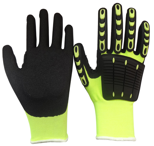 | DESCRIPTION | - 13 gauge Hi-vis yellow polyester liner; Sandy nitrile coating on palm - TPR on back of gloves; - Leather on middle concave part betweenthe thumb and index finger - Impact resistance - Elastic knit cuff |