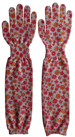 | DESCRIPTION | -13 gauge seamless polyester knittinglining with printing flowers -White mini PVC dots on palm -Ultraviolet-proof |