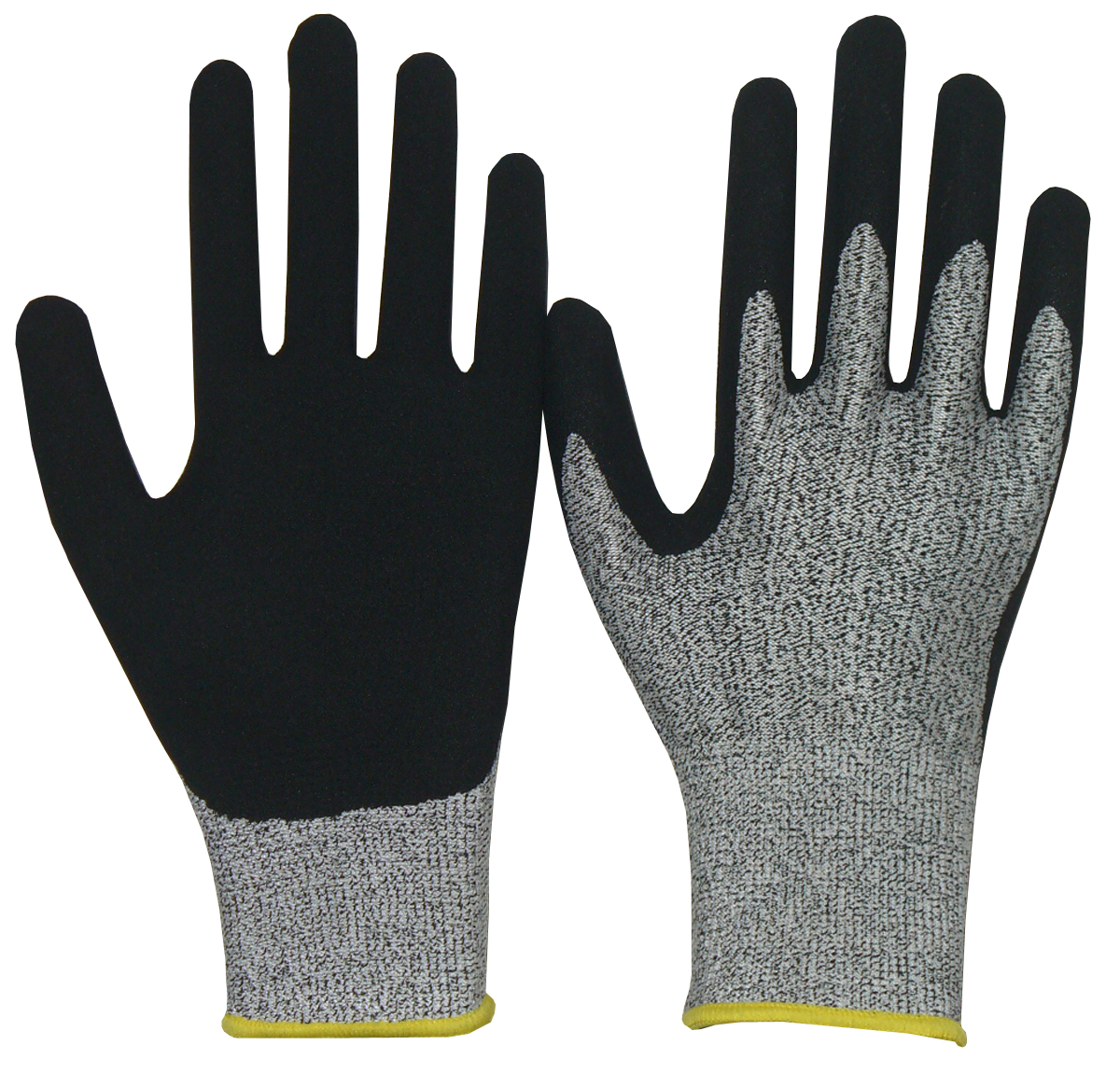 | DESCRIPTION | - 13 gauge seamless UHMWPE fibre lining; sandy nitrile coating on palm. - Superior resistance to abrasion and cut provide safety work - Sandy nitrile coating provides better grip and comfort - Cut level 3 or 5 is available - Elastic knit wrist |